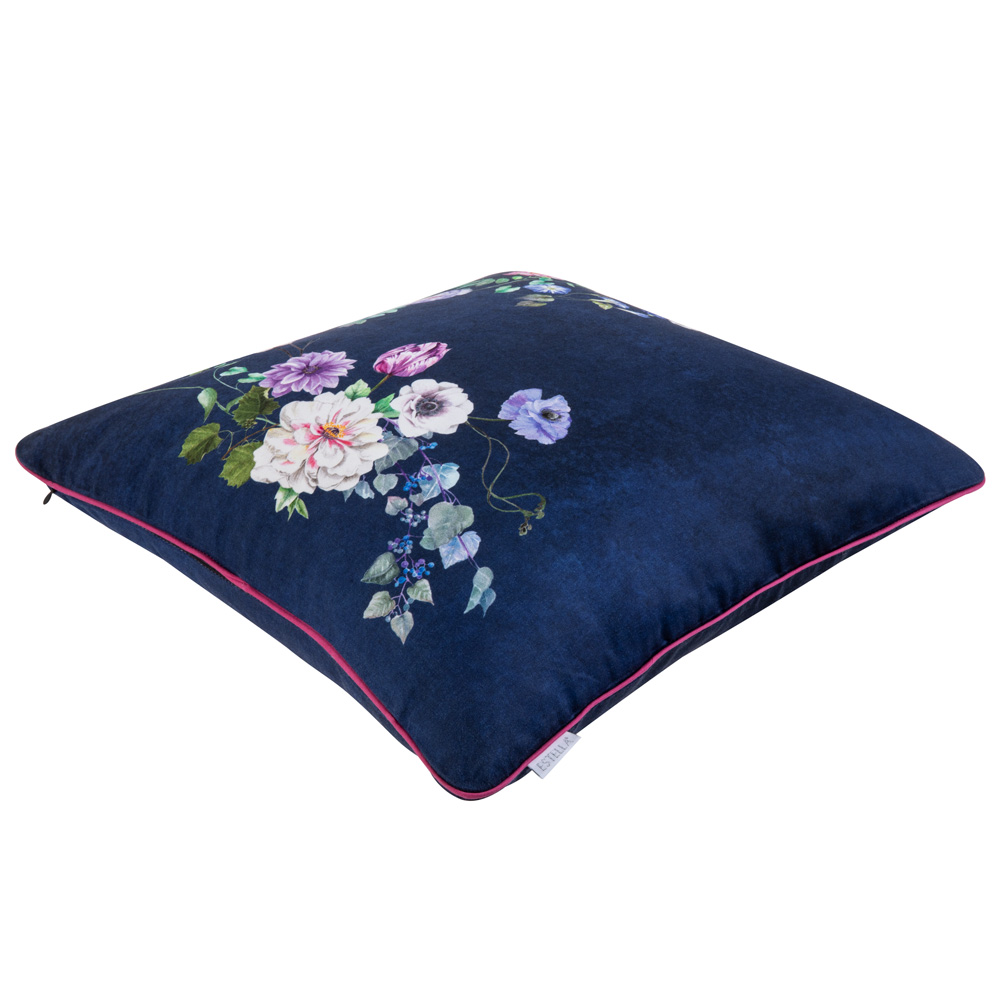 Blumig, edel, stilvoll: Mit den dekorativen Kissenbezügen Euphoria verleihen Sie Ihrem Zuhause den letzten Schliff. Der nachtblaue Mako-Satin ist ein echter Handschmeichler. Auf ihm präsentiert sich ein zartes Blumenmotiv, das als elegante Ranke drei der vier Kissenecken dekorativ umrahmt. Zusätzlich veredelt eine 4-seitige Paspel in auffallend abgesetzter Kontrastfarbe die hochwertig verarbeiteten Kissenkanten.