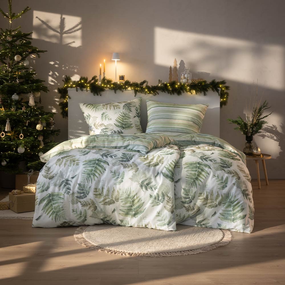 Die Bettwäsche Fern Leaves in der Farbe Grün bringt die beruhigende Kraft der Natur direkt ins Schlafzimmer. Das detailreiche Farnmotiv in verschiedenen Grüntönen wirkt frisch und lebendig, während die Rückseite in sanfter Streifenoptik einen stilvollen Kontrast bildet – perfekt für alle, die Natürlichkeit und dezente Eleganz lieben.