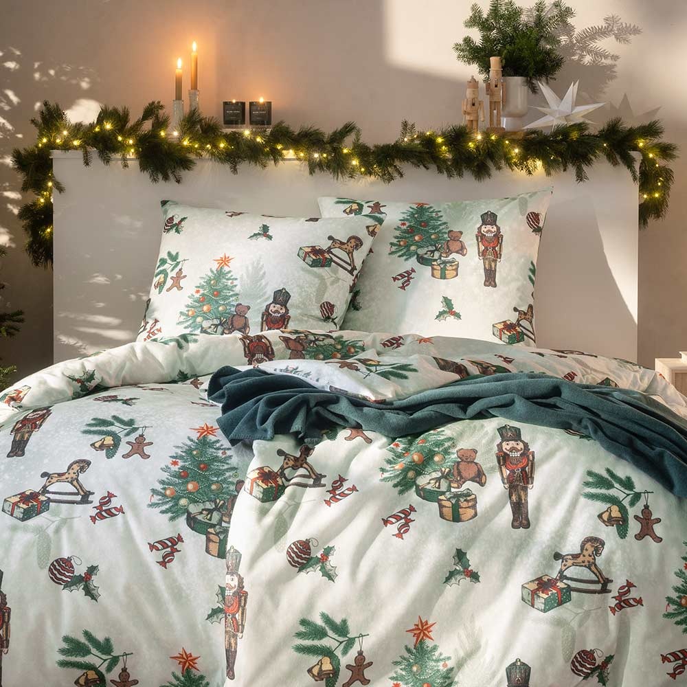 Die Bettwäsche Nutcracker in der Farbe Rot verwandelt dein Schlafzimmer in ein weihnachtliches Winterwunderland. Das charmante Design mit klassischen Nussknackerfiguren, reich geschmückten Tannenbäumen, Lebkuchenmännchen, Zuckerstangen und festlichen Geschenken bringt festliche Stimmung in jedes Zuhause. Die detailverliebten Illustrationen auf hellem Fond erinnern an nostalgische Weihnachtsträume und machen diese Garnitur zu einem echten Highlight in der Adventszeit.