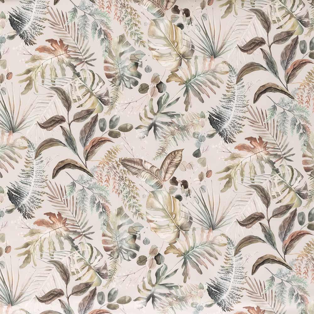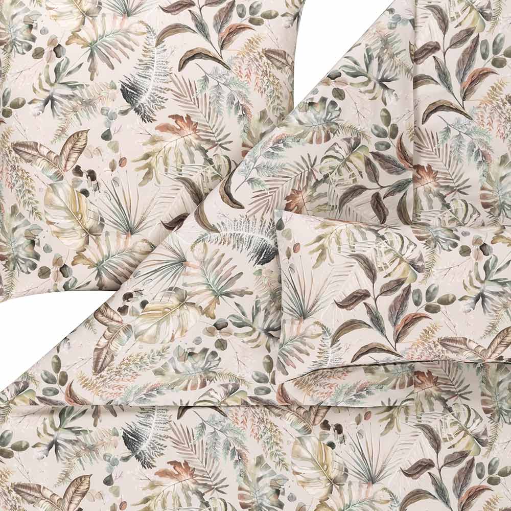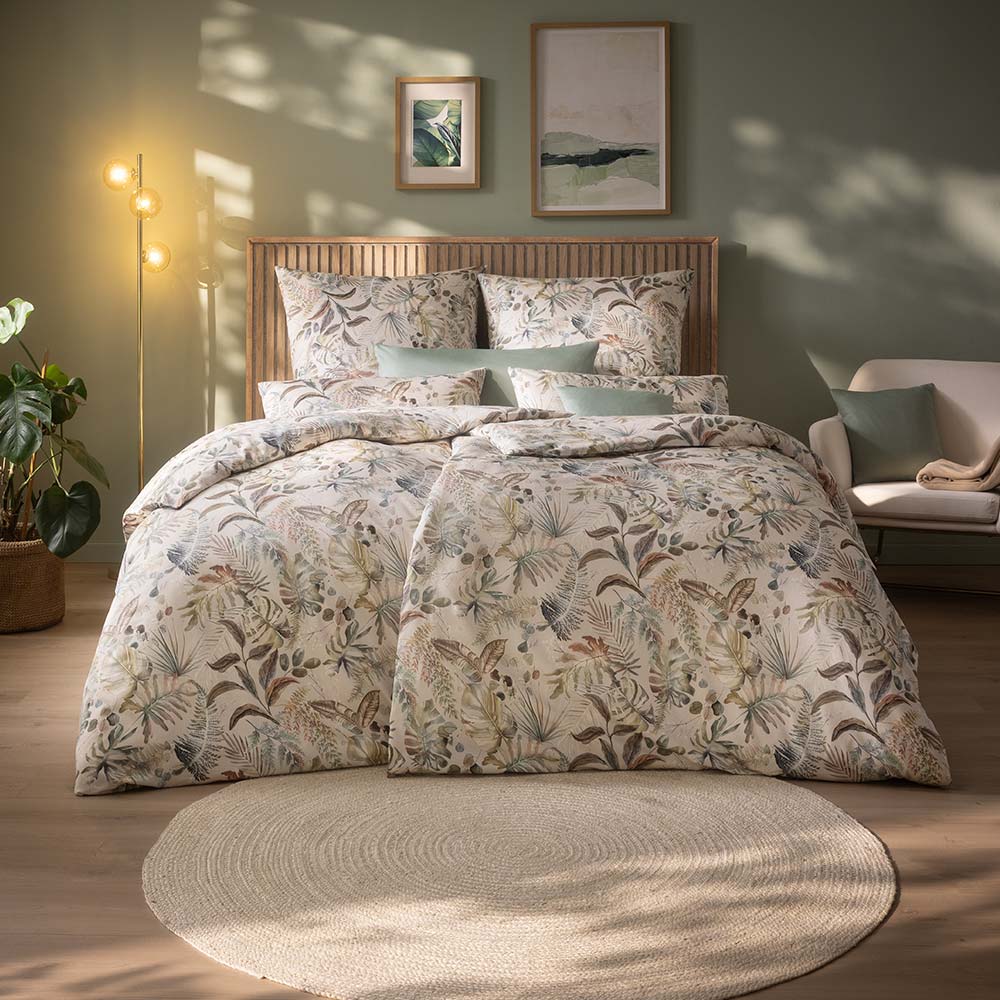 Die Mako-Satin-Bettwäsche Alea in der Farbe Puder überzeugt mit einem harmonischen Tropen-Print in dezenten, warmen Naturtönen. Zarte Beige-, Braun- und Grüntöne treffen auf stilisierte Palmenblätter, Farn und florale Elemente – ein Design, das Ruhe, Natürlichkeit und stilvolle Exotik ins Schlafzimmer bringt.