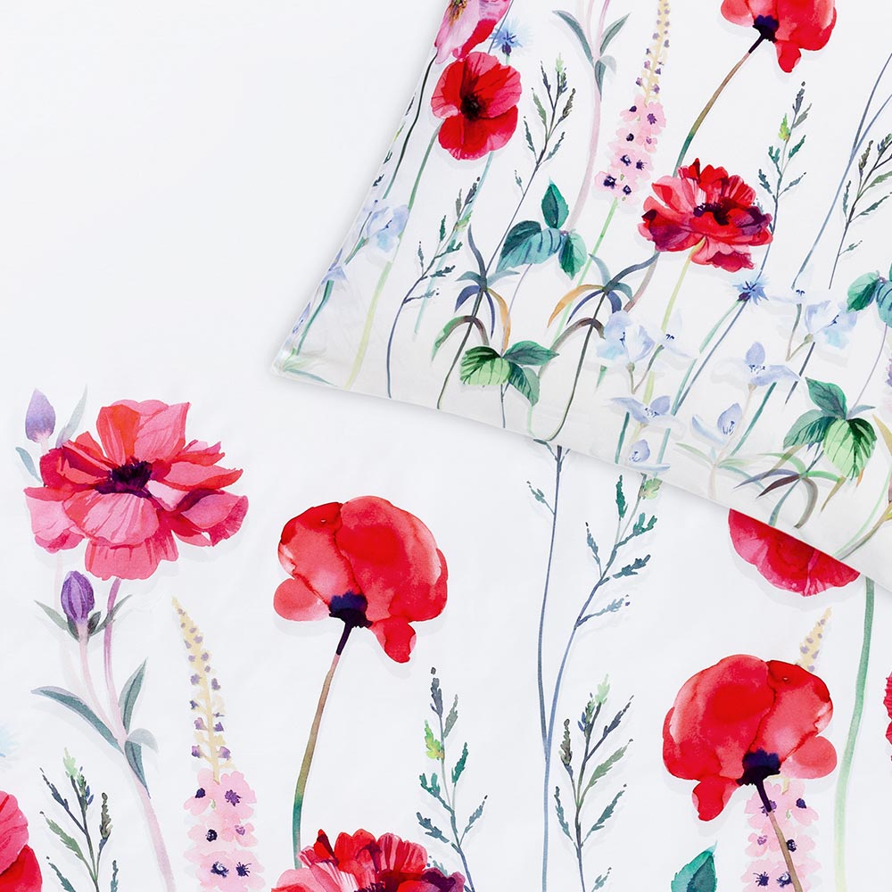 Roter Klatschmohn lässt grüßen – auf den Kissen- und Bettdeckenbezügen der Garnitur Christy. Dank des Blumendekors in leuchtendem Rot, Blau und Grün auf weißem Hintergrund erzeugt das Set eine frühlingshafte Ästhetik. Die zarten Blüten und filigranen Stängel wirken wie ein kunstvolles Aquarell, das individuell kombiniert mit silbernen oder jadefarbenen Accessoires noch einmal mehr zu Geltung kommt.