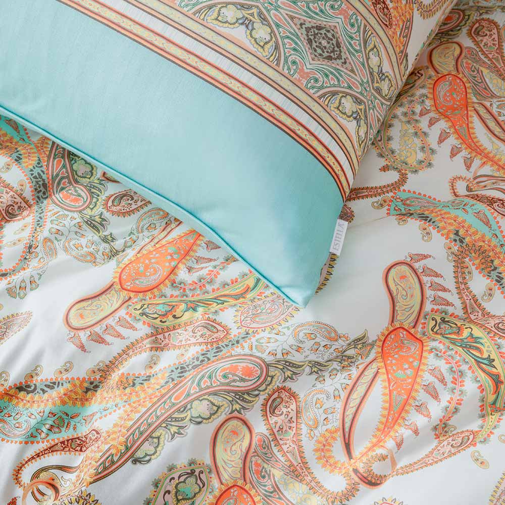 Der Orient lässt grüßen mit deinen neuen Bezügen der Bettwäschegarnitur Siena. Ihr kunstvolles Paisley-Muster in warmen Orangetönen, die auf einem azurblauen Hintergrund erstrahlen, spricht eigentlich schon für sich. Die feinen Bordüren verleihen dem Design zusätzliche Struktur und erinnern dabei an traditionell verzierte Stoffe. So wird dein Bett im Nu zum neuen Highlight deiner vier Wände.Hergestellt aus bügelfreiem Mako-Interlock Jersey in reiner Baumwollqualität, sorgt die Bettwäsche für ein besonderes Schlaferlebnis auf ganzer Linie.