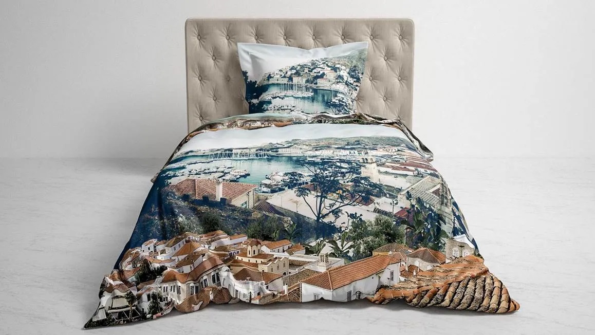 Träumen Sie unter dem Bettbezug Nada von Heckett & Lane. Wachen Sie auf und genießen Sie einen wunderschönen Blick über eine Bucht voller Boote und eine terrakottafarbene Stadt. Für einen Moment scheint es, als wäre man wirklich im Urlaub und habe diese atemberaubende Aussicht. Oder drehen Sie die Abdeckung um und genießen Sie ein Segelboot im azurblauen Wasser, umgeben von wunderschönen Felsen. Genieße die Stille um dich herum. Die Kissenbezüge sind ebenfalls mit beiden Drucken versehen und mit einer Oxford-Kante versehen.