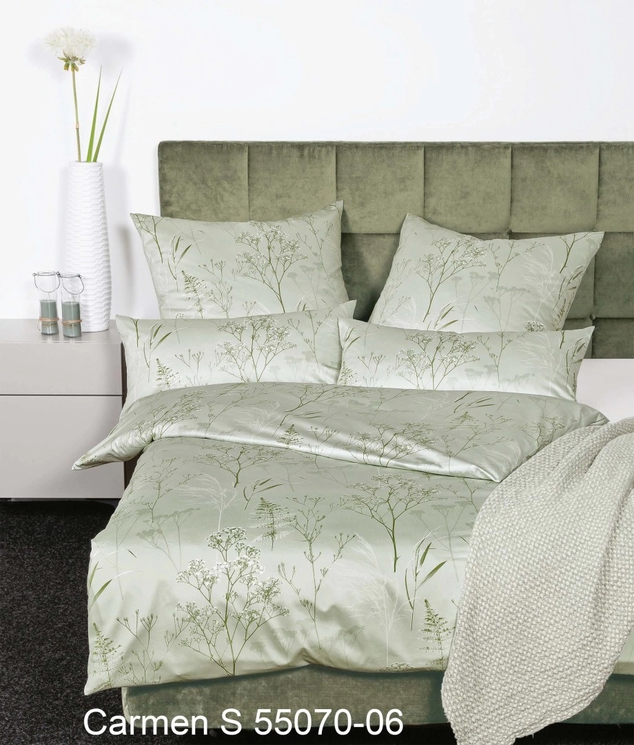 Die unverwechselbare, schlichte Eleganz ist das Markenzeichen der Janine Interlock- Jersey Bettwäsche Carmen S 55070 aus der aktuellen Herbst-/ Winterkollektion von Janine. Auf dem salbeigrünen Untergrund schlummern kuschelweiche Farne und Schleierkraut und laden zum Verweilen ein. Das dezente Design der Bettwäsche von Janine lässt sich – mit seinem zarten floralen Print – ohne Weiteres zu verschiedenen Einrichtungsstilen kombinieren und schafft eine angenehme Ruhe für eine traumhafte Schlafumgebung. Das erlesene Interlock-Jersey verleiht der Garnitur mit seinen hautsympathischen Eigenschaften den letzten Feinschliff garantiert auch in kühleren Nächten traumhaften Schlaf.