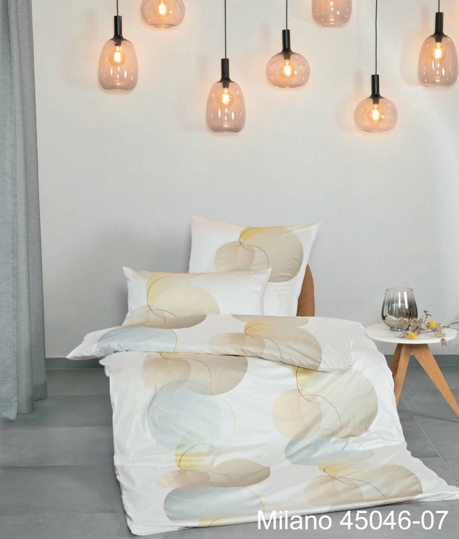 Unterschiedlich große Kreise, in der erfrischenden Farbkombination von Naturell, Bernstein und Silber erstrecken sich gleichmäßig horizontal auf der Bettwäsche. Dank des immerwährenden Designs passt sich die Garnitur unterschiedlichsten Einrichtungsstilen an und gilt stets als moderner Hingucker. Doch nicht nur das Dessin der Bettwäsche von Janine liegt absolut im Trend, auch die besonderen Eigenschaften des Mako-Satins werden Sie beeindrucken! Denn der hautsympathische Stoff liegt angenehm weich auf Ihrer Haut und sorgt auch in heißen Sommernächten für erholsamen Schlaf. Kennzeichnend für die Dessins dieser Serie sind die oft handgezeichneten Designs mit besonderen Details, die durch die fein und aufwendig ausgearbeiteten Gravuren besonders gut zur Geltung kommen. Die Dessins der Serie Milano werden in hochwertiger Atelier-Konfektion gefertigt. Durch sorgfältigen Zuschnitt wird eine absolute Maß-Präzision und Formstabilität erreicht. Die Nähte sind sorgfältig und dauerhaft haltbar verarbeitet. Mit dem speziell entwickelten Marken-Reißverschluss wird eine bequeme Handhabung erreicht.