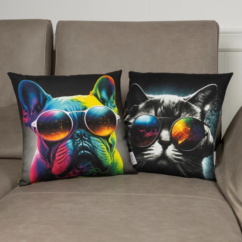 Dieses steylische Kissenhülle in knaligen Neonfarben ist der absolute Eyecatcher in jedem Raum. Das freche Motiv zeigt eine Katze mit Sonnenbrille-lässig, charmant und Star-Appeal. Egal ob auf dem Sofa, im Bett oder als Highlight im Jugendzimmer- diese Kissenhülle bringt Farbe, Spaß und tierisch gute Laune in Ihr Zuhause.Mach Sie Ihr Zuhause bunter und holen Sie sich diese ultracoole Kissenhülle mit Guter-Laune-Garantie!