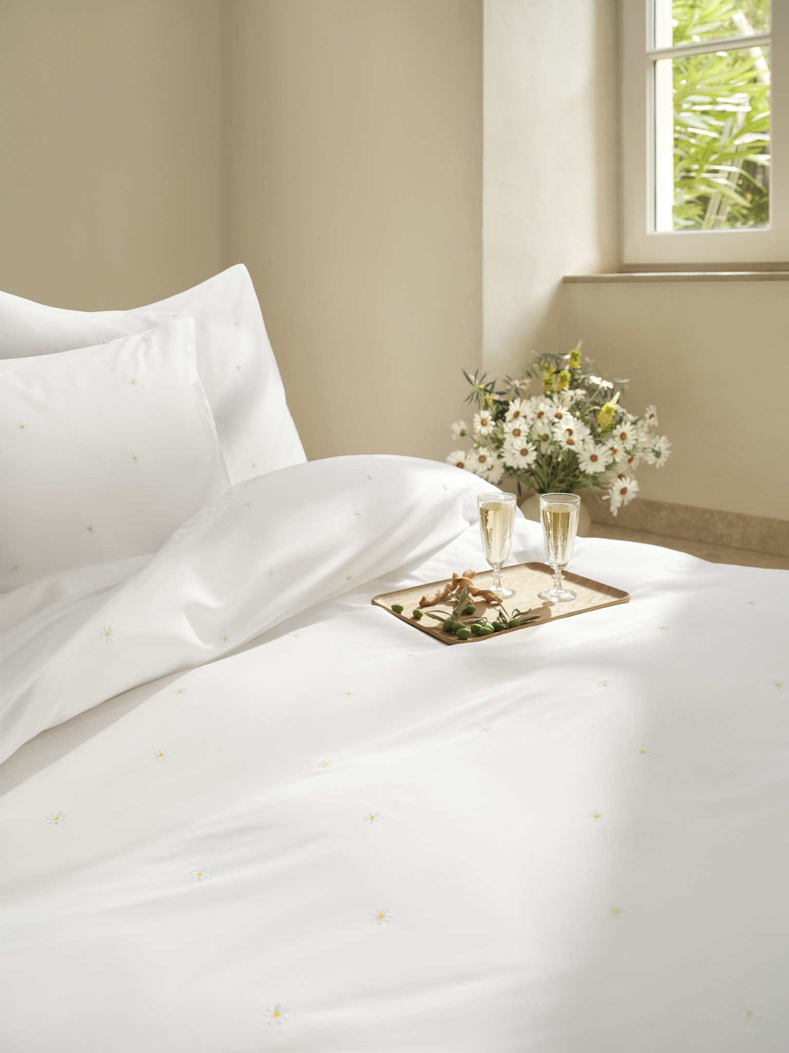 Wo die heimische Gartenwiese wie auch die eigene Bettwäsche die Erinnerungen an Blumenkronen und Sommerboten weckt, da bezaubert DAISY so lieblich, filigran und wunderbar leicht zugleich mit ihren aufgestickten Gänseblümchen – zierlich und erhaben tänzeln die kleinen Schmuckstücke auf der Oberseite über den reinweissen Satin, wird doch erst beim genauen Betrachten klar, wie individuell jede Blüte erscheint. Zeitlos, klassisch und elegant weht mit DAISY garantiert bald eine sanfte Brise Sommer hinein ins Schlafzimmer.