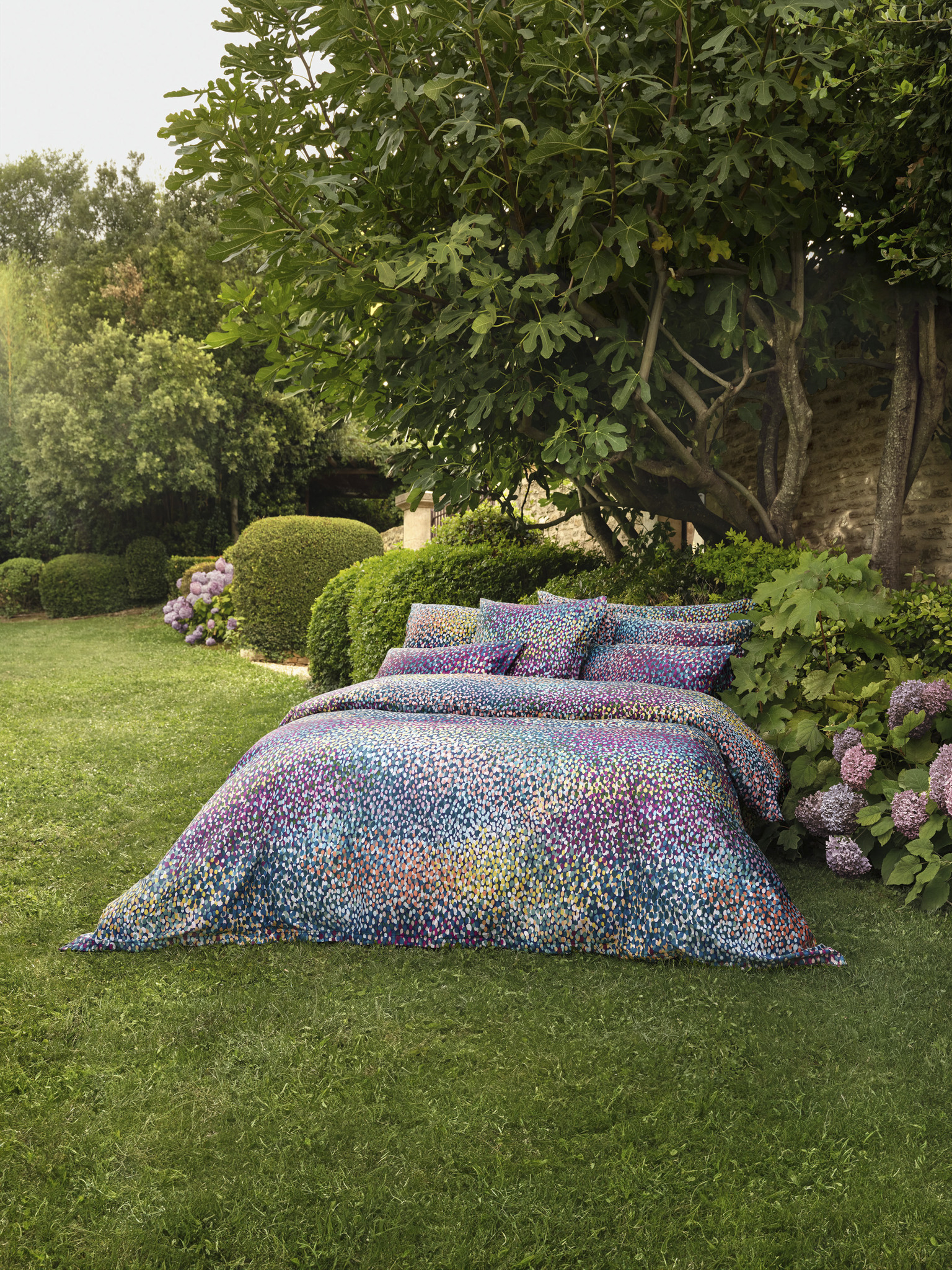 Inspiriert von pointillistischen Gemälden oder auch dem Anblick einer blühenden Sommerwiese aus luftigen Höhen zieht die Bettwäsche JANA fast unwiderstehlich in ihren Bann und lädt dazu ein, in dieses berauschende Meer aus Farbtupfern einzutauchen. Zahlreiche Nuancen aus goldenem Ocker, samtigem Veilchenblau, silbernem Grau, Blau- und Grüntönen wollen von Nahem entdeckt werden und laden in den herrlich blühenden Garten ein – aufgetragen in Handarbeit und in mehreren Schichten entsteht auf dem leuchtend, dunkelblauen Hintergrund das organische, lebendige Design in Gouache.