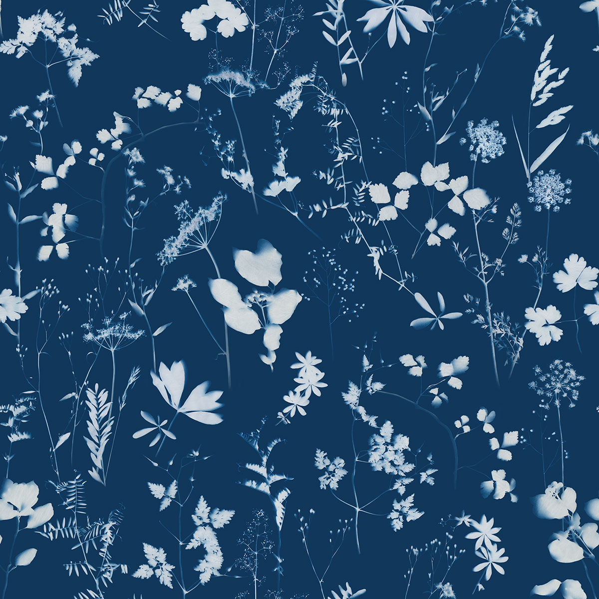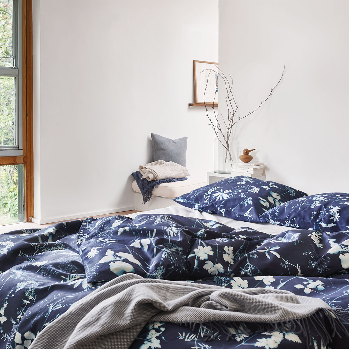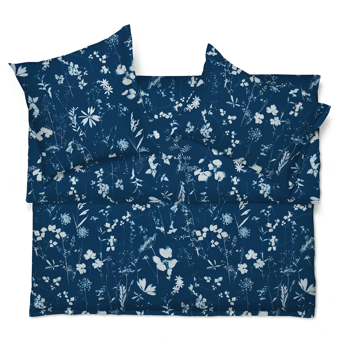 Das tiefe Nachtblau untermalt die Wiesengräser im Fond der Bettwäsche Elia. Die Zeichnung gleicht einem alten fotografischen Verfahren, der Cyanotypie. Die von Wiesen und Waldrändern in der Schweiz gepflückten Blumen und Gräser wurden in unserem Atelier wie beim Blaudruck unter besonderer Belichtung des Sonnenlichts arrangiert. Das Ergebnis: filigrane Blätter- und Blütenabdrücke mit leuchtenden Schattierungen in Cyanblau, Petrol und softem Grau.