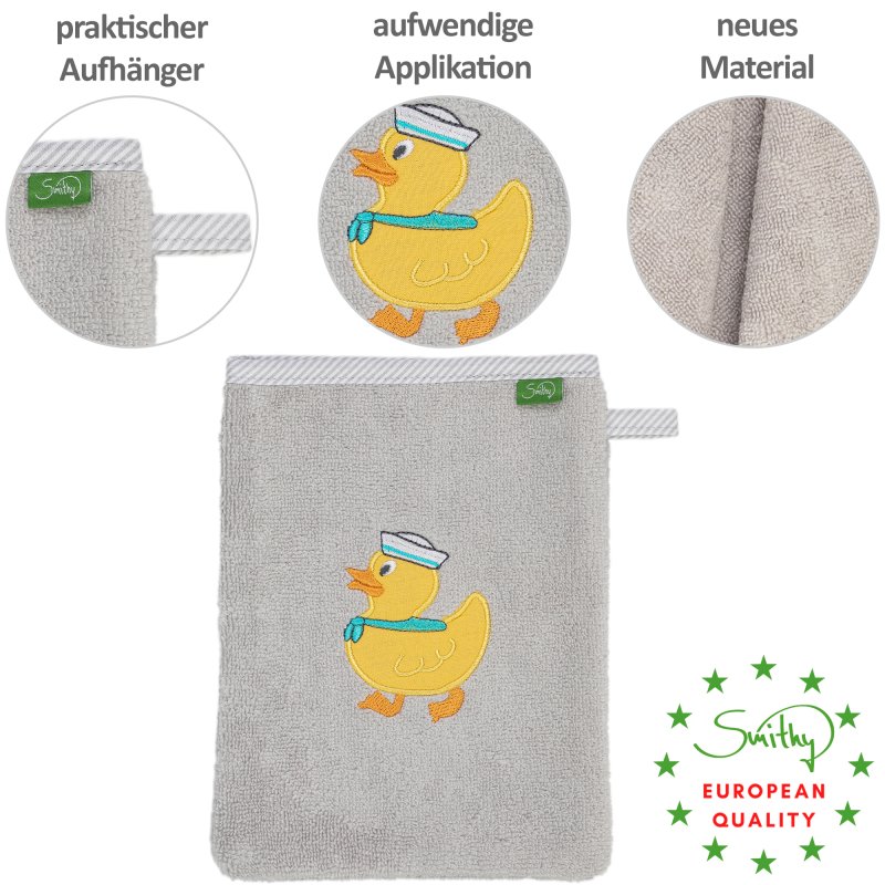 Kuschelige Frottier-Serie aus Luxus Baumwolle mit hochwertiger Enten Applikation auf hellgrauem Untergrund. Das süße Motiv lässt die Augen der Kinder erfreuen. Süßes Motiv kombiniert mit praktischer und pflegeleichter Frottierware.